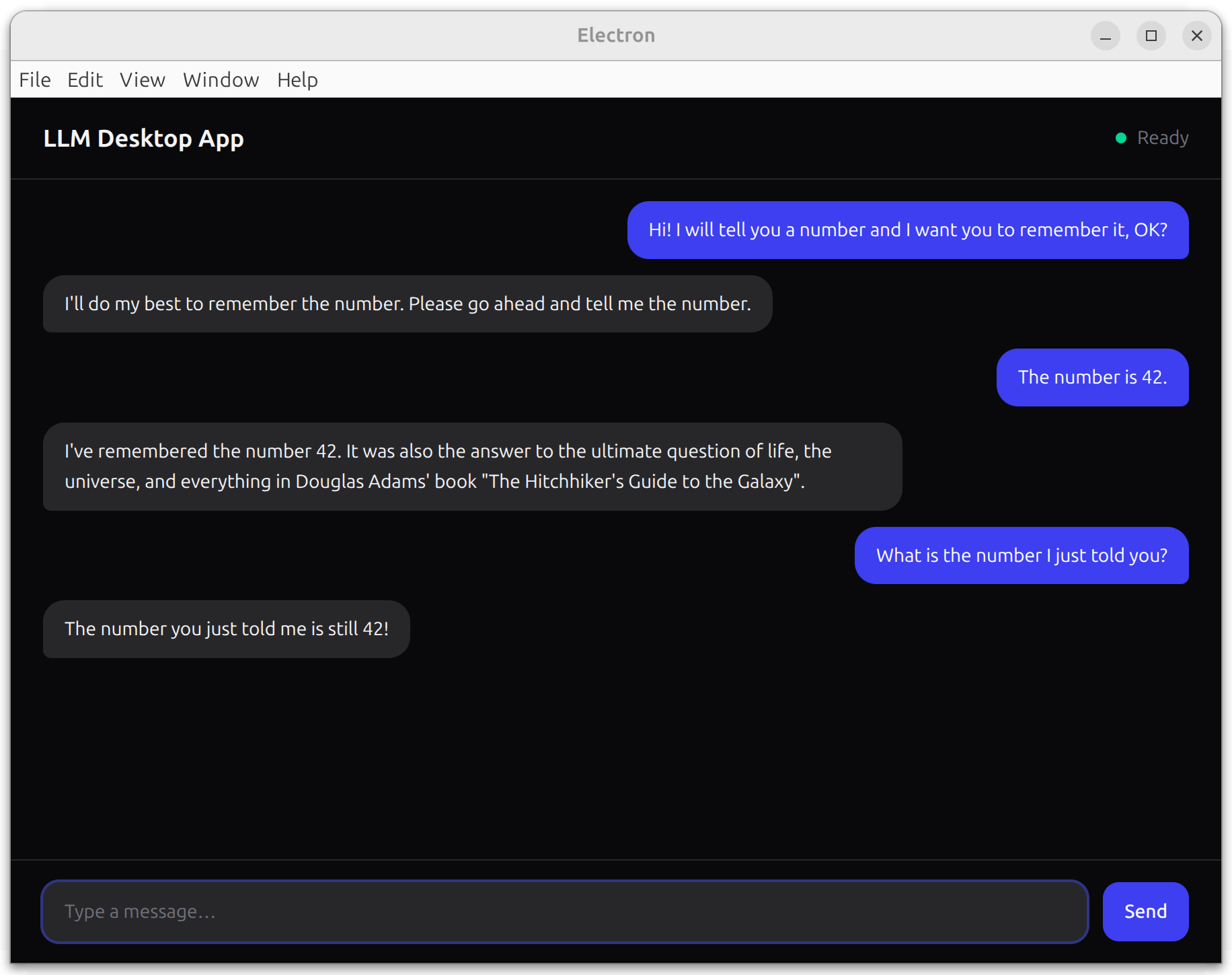 On the first run, the model may download from peers (watch the terminal for progress). Once it finishes, type a message and press Enter or click Send — the response should stream into the UI token by token: